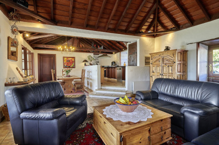 Vom Wohnbereich geht es es paar Stufen hinauf in die offene, sehr gut ausgestattete Küche. Das Holz für den Kamin wird gestellt, im Wohnbereich sowie in den beiden Bädern gibt es zusätzlich Zentralheizung. Von allen Räumen aus führen Türen auf die große Terrasse mit Panoramablick (Süden und Westen).